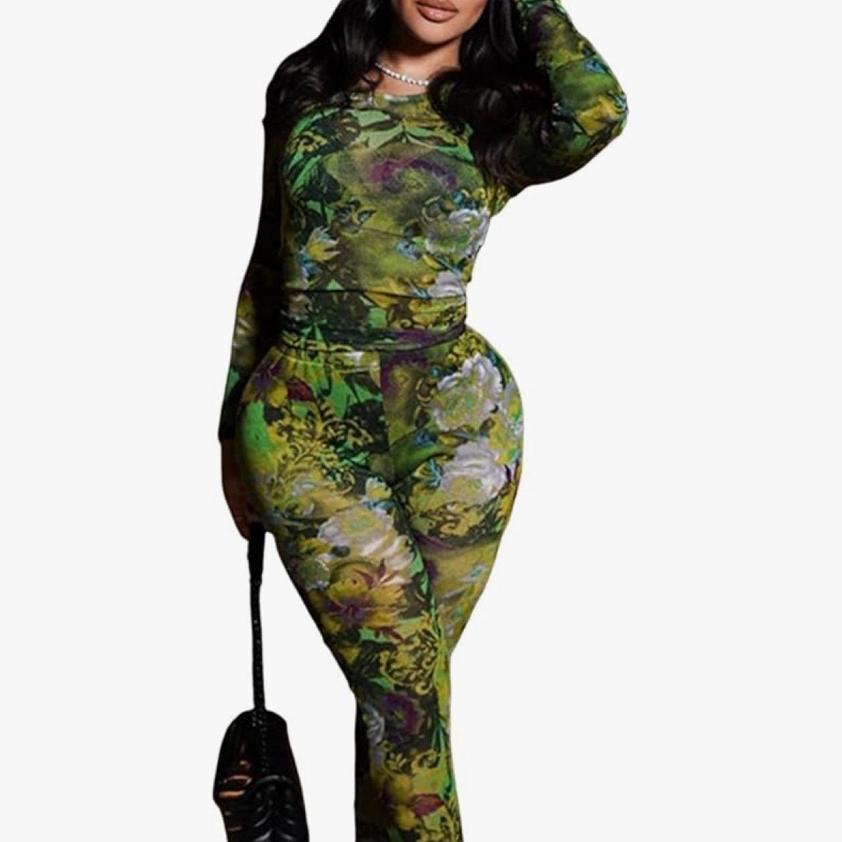 Floral Print See-Through Mesh Set green outfits two-piece set matching